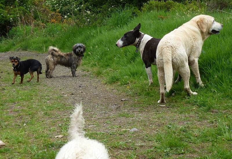 The walk at Gleddoch golf course is right next to where Bonnie lives so I picked up all the dogs and headed to Bonnie’s house. Bonnie is such a great dog! You can arrive at her house with any new dog(s) and she’s more than happy to have them on her turf. She’s as quiet as a mouse, walks right next to you only occasionally leaving your side to have a sniff at something or a paddle in the water and she seems to be so happy and cheery all the time with no aggression whatsover.