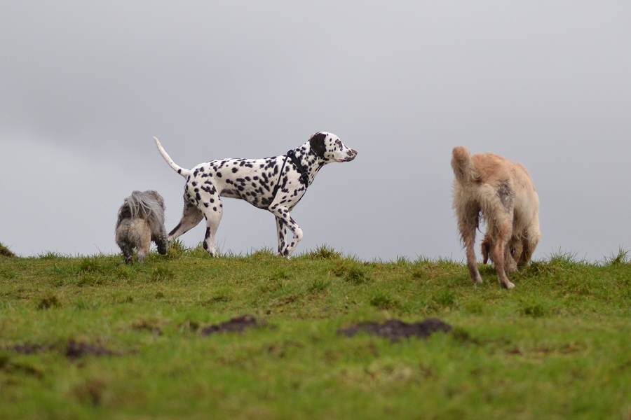 Today we began walking Lola, an 8 month old Dalmatian from Bargarran. She joined fellow pup Elsa from Bishopton who is also around the same age and size so they both had a blast and played the whole time they were together. Ruffles and even wee Chilli joined in with playing with their new pack mate as we walked in Langbank. And even though it rained (which meant I could only take a few photos) and was bogging the dogs had a lot of fun!