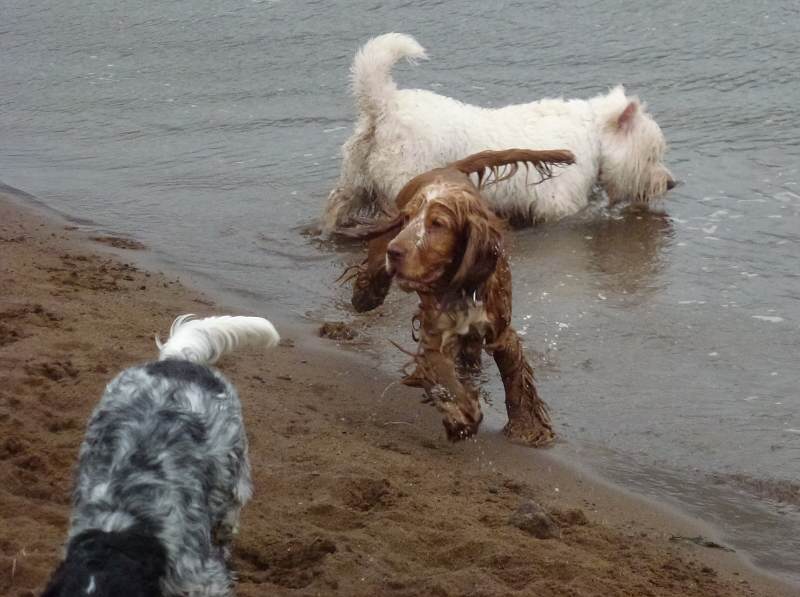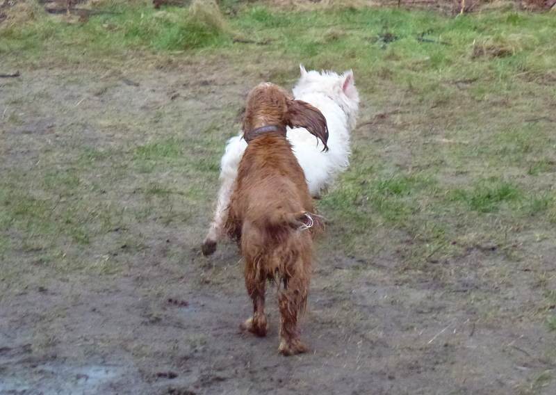 Today on his second walk we also brought along golden cocker spaniel, Penny!! Mack joined in the fun and games with the others, he’s very sociable, loves running and chasing other dogs and wherever the dogs ran, he ran along beside them. He also took instantly to Penny (like most dogs do) and I think he’s already got a wee soft spot for her! He’s a surprisingly confidant little chappy with other dogs and just wants to have fun and get into the middle of whats going on. He was much, much more relaxed today during his second walk…he took treats when offered… when I called him he came running and he and the others had a great time and did loads of running about. He’ll lose weight in no time and have loads of fun doing it!