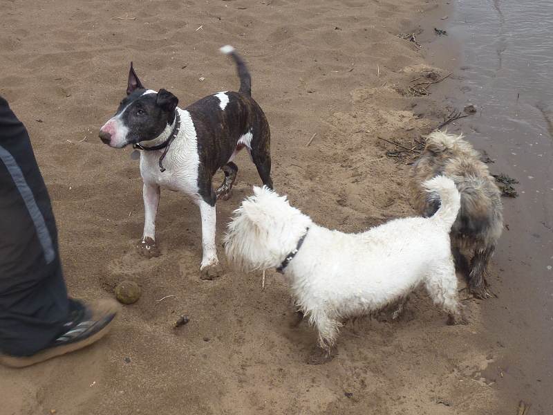 Since Wilfred the (very large) miniature bull terrier is 10 years old and a lot older than the young 'uns he likes to do his own thing. Wilfie (as he's known) loves swimming more than anything else and spent most of the walk walking the coast line. We were throwing in tennis balls for him to bring back but not for too long as we didn't want him to get too cold.